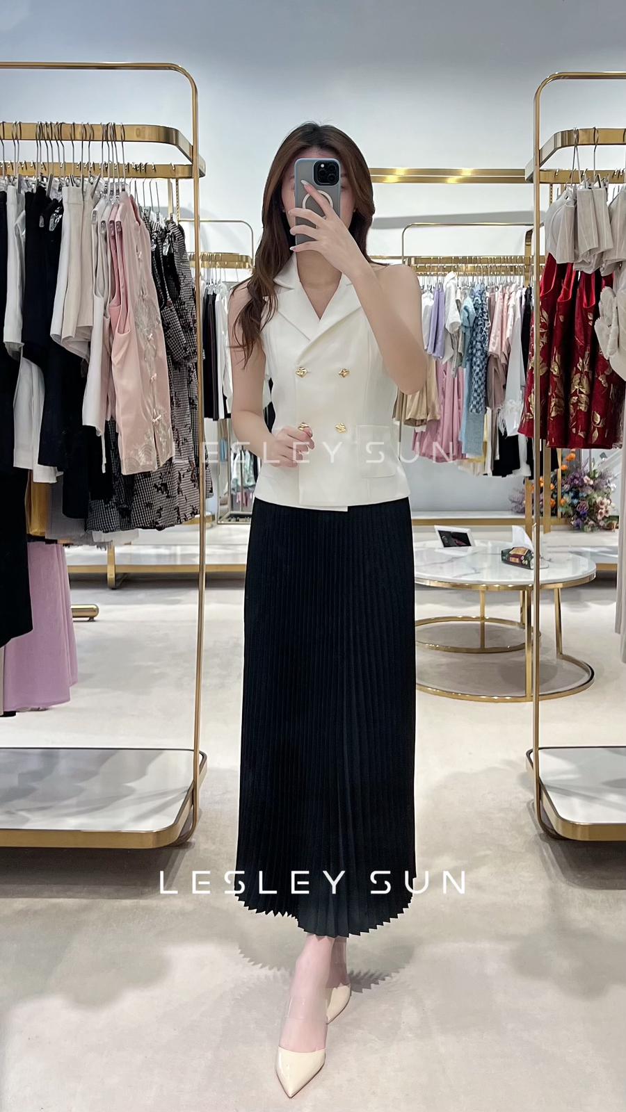 A chic halter-style vest that redefines modern sophistication. The Caledon Top features a structured silhouette with a double-breasted front, accentuated by statement buttons for a touch of polish. Designed with a flattering open-back halter neckline, it brings together strength and femininity in one sleek piece. Perfect for pairing with tailored pants or skirts for an effortlessly sharp and elegant look.