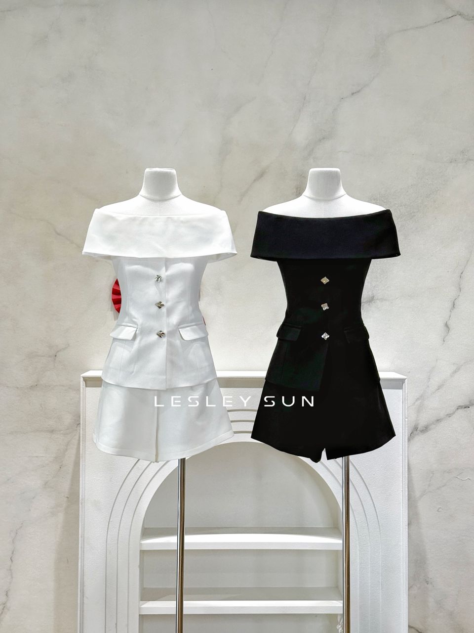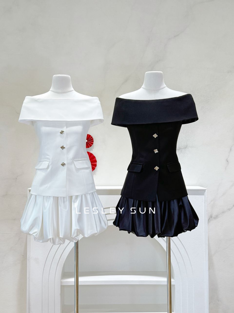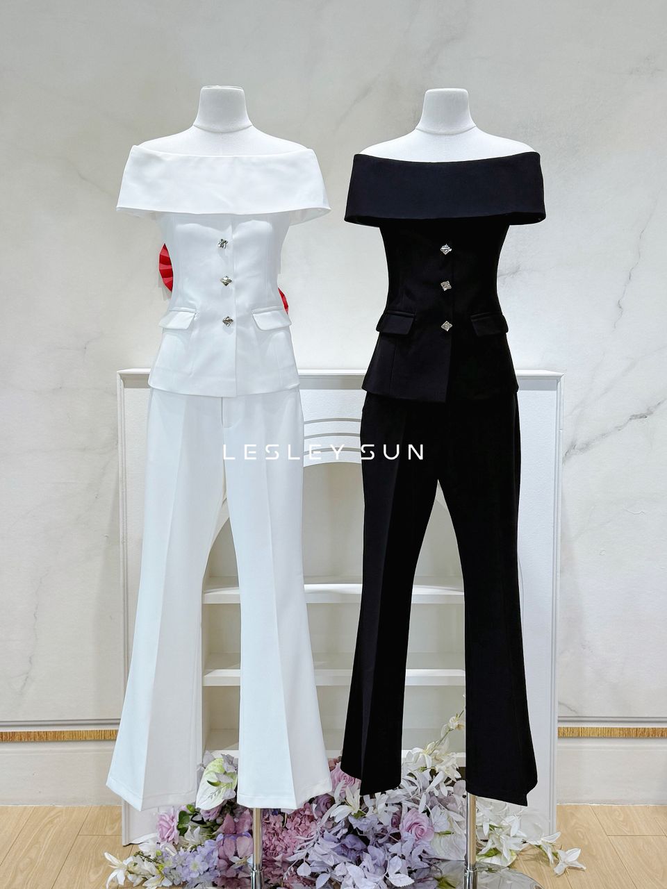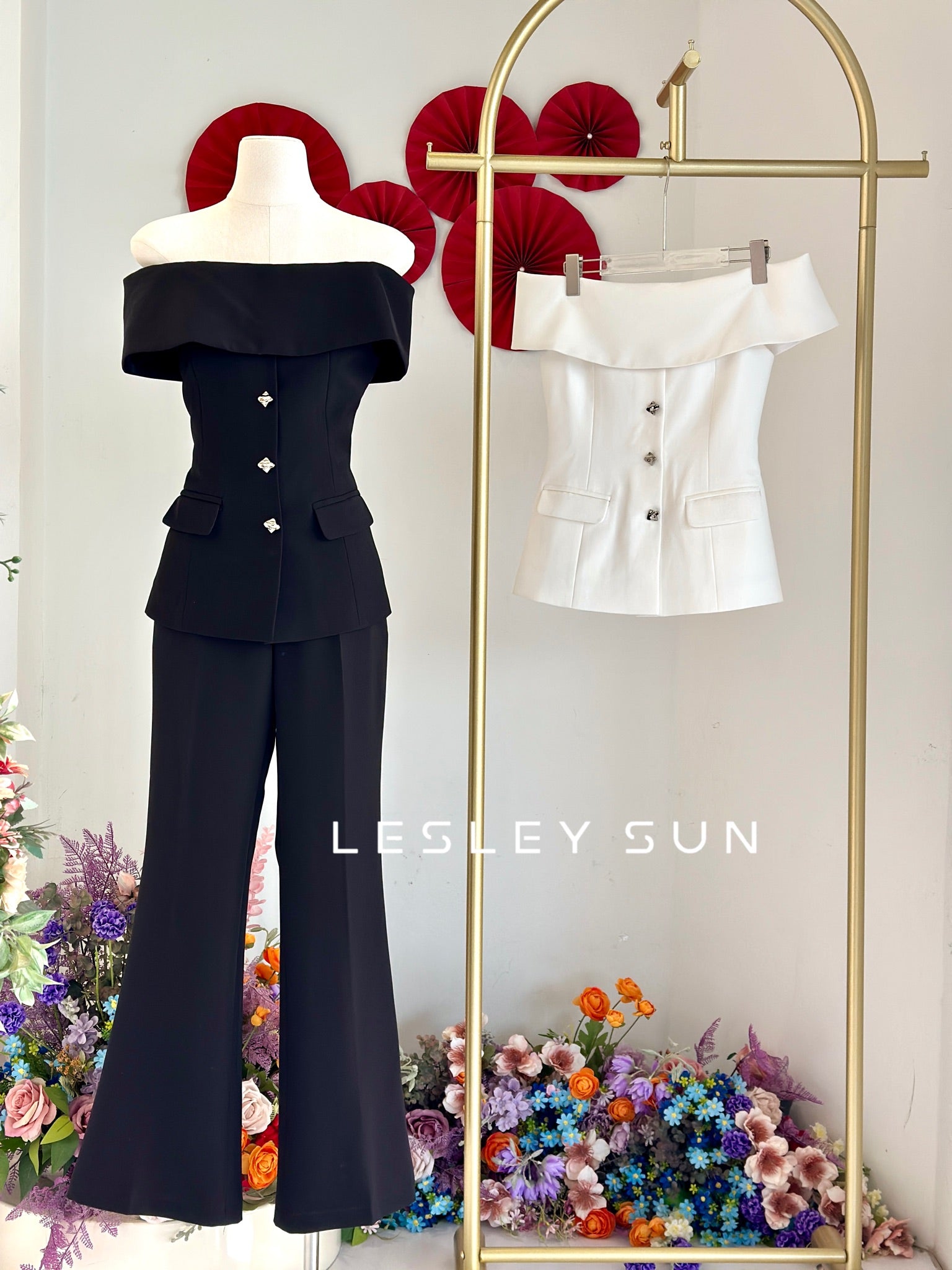 A refined piece that blends structured tailoring with a soft, romantic touch. The Oberyn Top features a wide off-shoulder neckline that drapes gracefully, creating a flattering silhouette that highlights the collarbone. Its fitted bodice is finished with refined buttons and clean panel lines for a polished look.