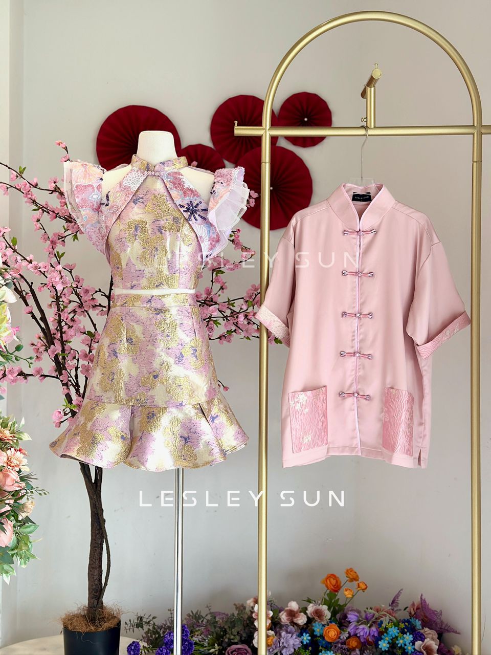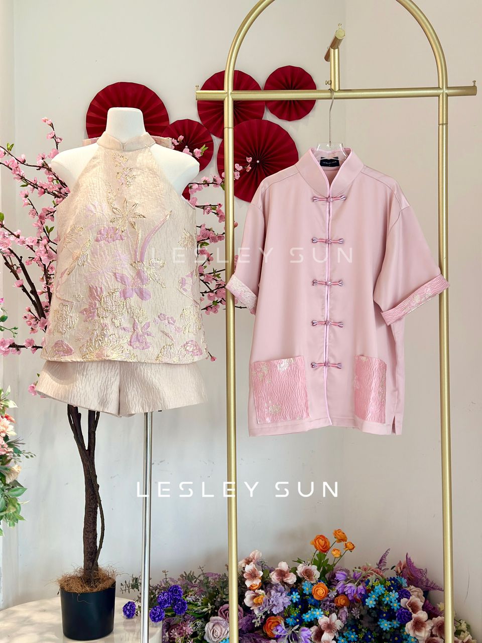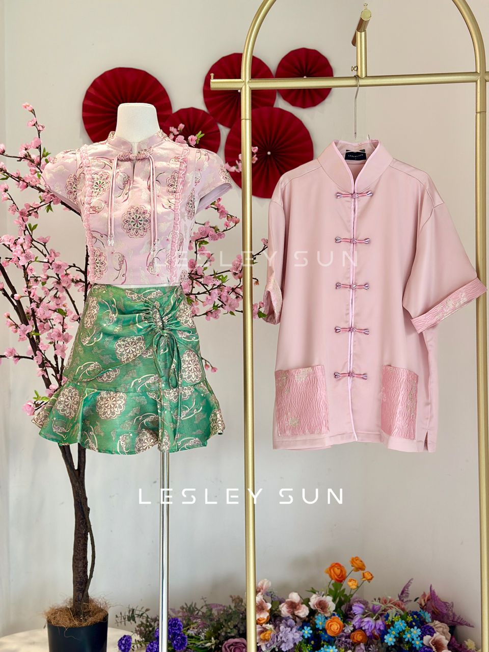 Softly sophisticated, the Virelai Orient Top (Male) redefines festive elegance in a romantic blush pink hue. Designed with classic frog button detailing and a mandarin collar, this top features textured jacquard accents on the cuffs and front pockets for a refined touch. Delicate floral embroidery adds depth and charm, making it an ideal choice for Chinese New Year visits, wedding celebrations, or styled-up family portraits with a graceful flair.