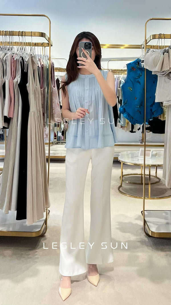 Giselda Top is a refined sleeveless piece defined by soft vertical pleats that fall effortlessly from the neckline, creating a light, fluid silhouette. Designed with a gentle round neckline and delicate front button detailing, it offers a graceful balance between...