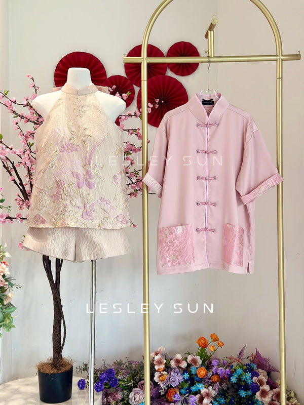 Ismeria Orient Set Purple Step into celebration-ready elegance with the Ismeria Orient Setwear. This two-piece ensemble features a sleeveless mandarin-collar top in deep crimson brocade, embroidered with lustrous gold florals that radiate opulence and festivity. Paired with matching satin shorts, the...