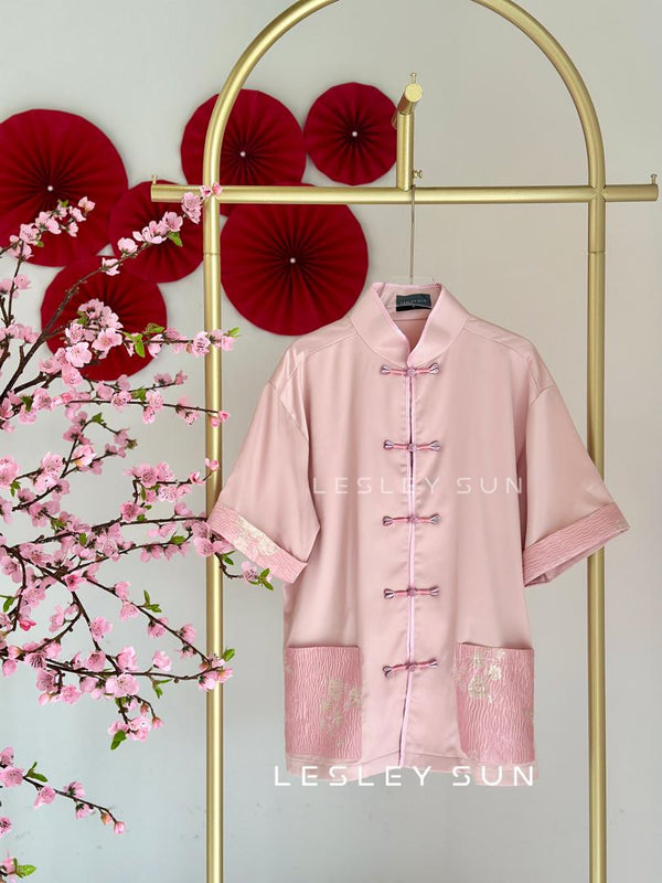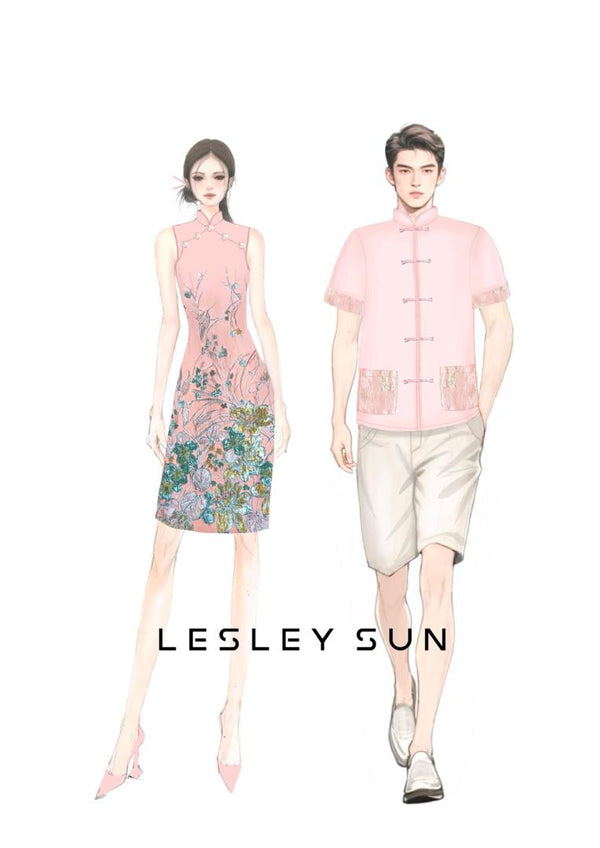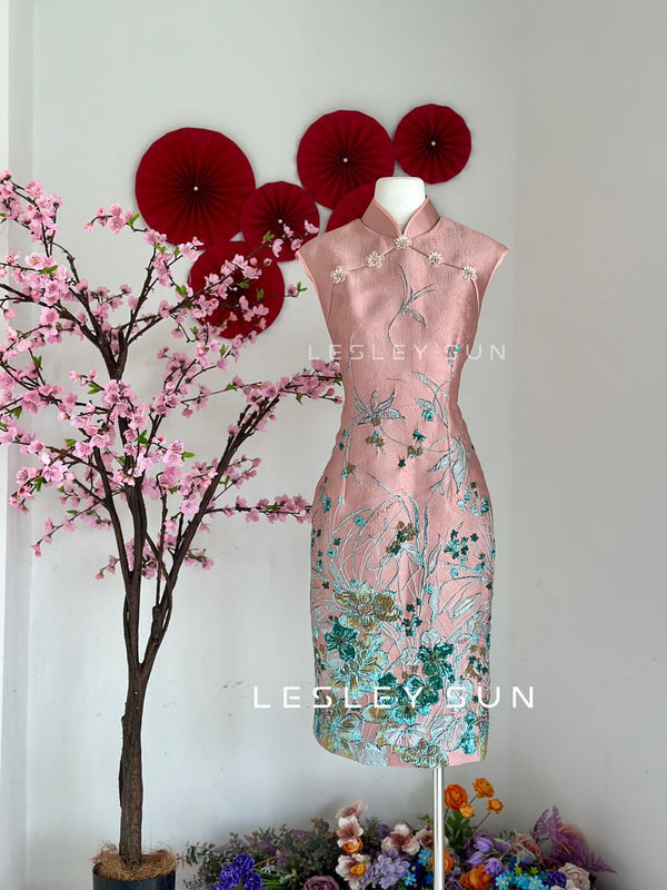 The Lunaria Orient Dress blends modern elegance with traditional charm. Crafted in blush pink jacquard, it features intricate teal and silver floral embroidery and delicate pearl flower buttons across the chest. The flattering cheongsam silhouette, complete with a mandarin collar...
