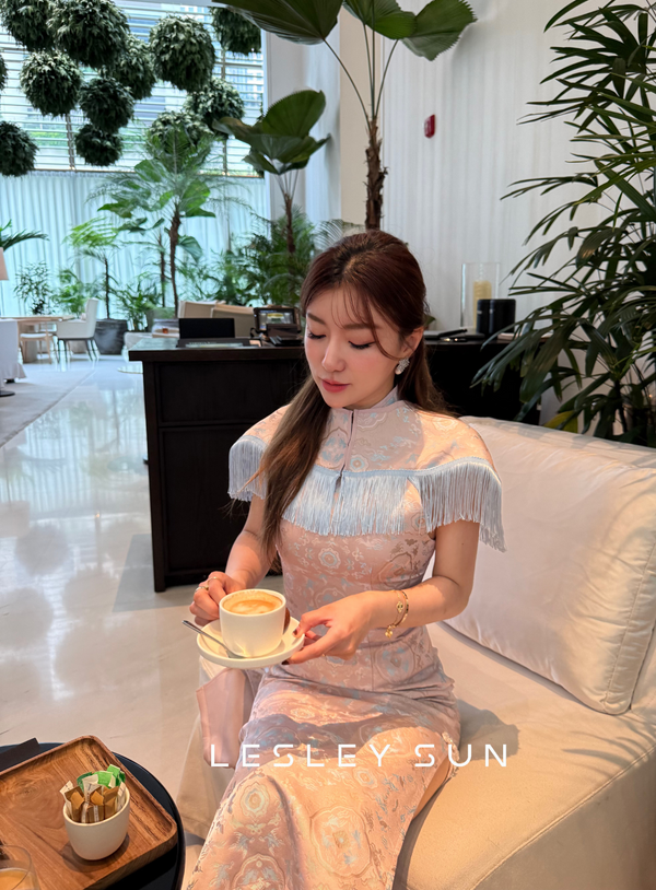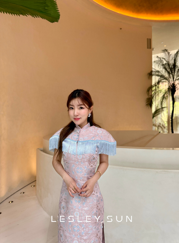 Selwyn Orient Dress, an elegant piece crafted with delicate oriental patterns in soft pastel tones. This dress features a unique removable cape with fringe detailing, allowing you to style it with or without for a versatile look. Its sleek, midi-length...