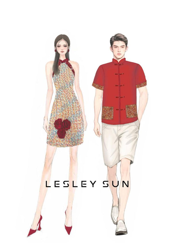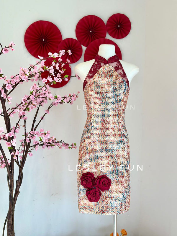 Shevina Orient DressExude bold femininity and festive flair in the Shevina Orient Dress. Designed in a richly textured multicolor tweed, this modern cheongsam silhouette features a halter neckline trimmed with elegant maroon lace for a refined, contemporary twist. The dress...